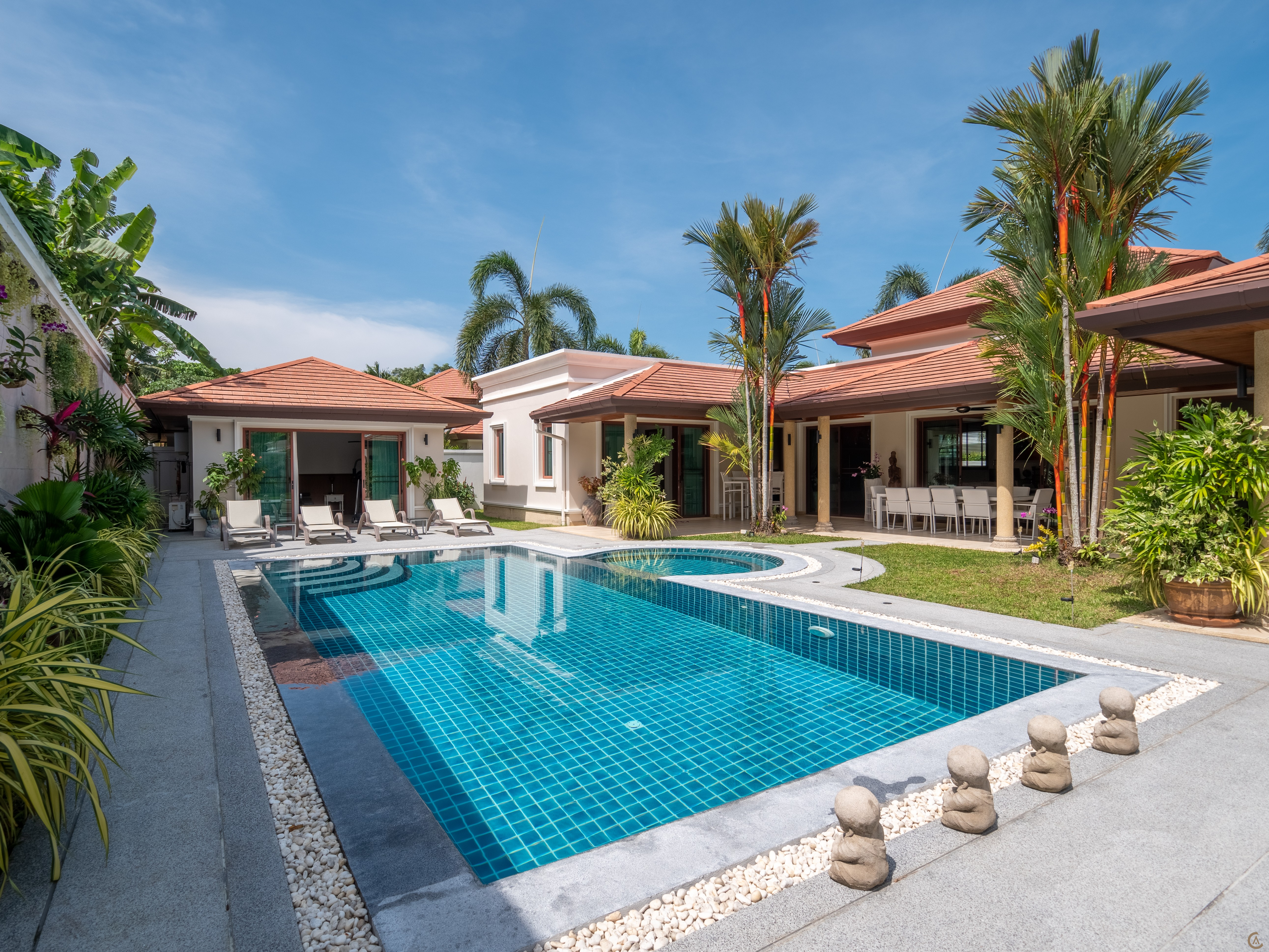 The villa has a covered parking area which you enter immediately you drive through the automatic gate. The tropical garden is dominated by a private swimming pool. The living space is made up of a lounge dining room and western kitchen. The western kitchen is beautifully fitted and provides top quality cabinets. The terrace is covered overlooked by the beautiful private swimming pool and garden. The villa is situated in near Boat Avenue and Laguna 1 minute to the shopping center of Boat Avenue and Porto de Phuket 5 minutes to Blue Tree Water Park and 5 minutes to Bangtao Beach
