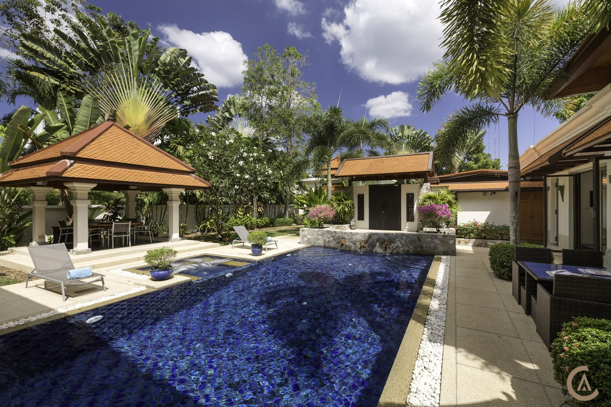 This luxurious private pool villa is situated close to Bangtao Beach on the west coast of Phuket near the entrance to the popular Laguna resort complex. The villa is on 968 sqm land plot, very well maintained and fully furnished. The villa features a separate lounge, dining room, open western kitchen and maids quarters. All rooms open on to the pool, the main focus of the home via concertina glass and hardwood doors and beautifully landscaped gardens surrounded by high walls for privacy. The guest villa is very well appointed with a sitting area and ensuite bathroom but fully self contained in a separate villa.